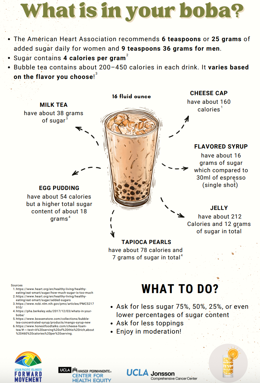 Back in 2016 I was a part of a coalition of groups pushing for a "Rethink Your Asian Drink" campaign. I was the Director of the API Obesity Prevention Alliance (APIOPA), a nonprofit group focused on addressing upstream issues related to worsening API health (obesity, diabetes, hypertension). Our small/mighty coalition saw the explosion in popularity of newer Asian drinks. You weren't just getting a milk tea boba like in the early 2000's; you were now choosing from many different coffees and teas, and throwing all sorts of chewy goodness to go along with it. This was on top of all the tasty childhood drinks bought at Asian markets.